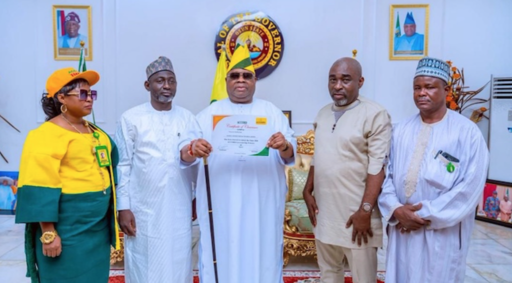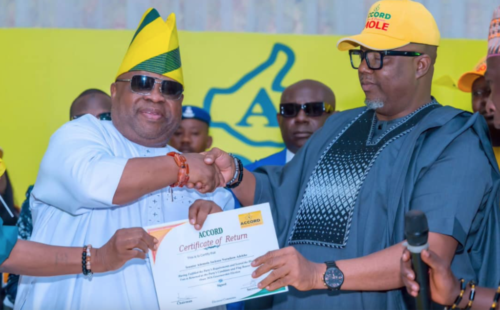 National Chairman of Accord Party, Maxwell Mgbudem, who handed over the certificate of return and victory to Adeleke said the primary election had confirmed Accord as a party of due process and internal democracy.